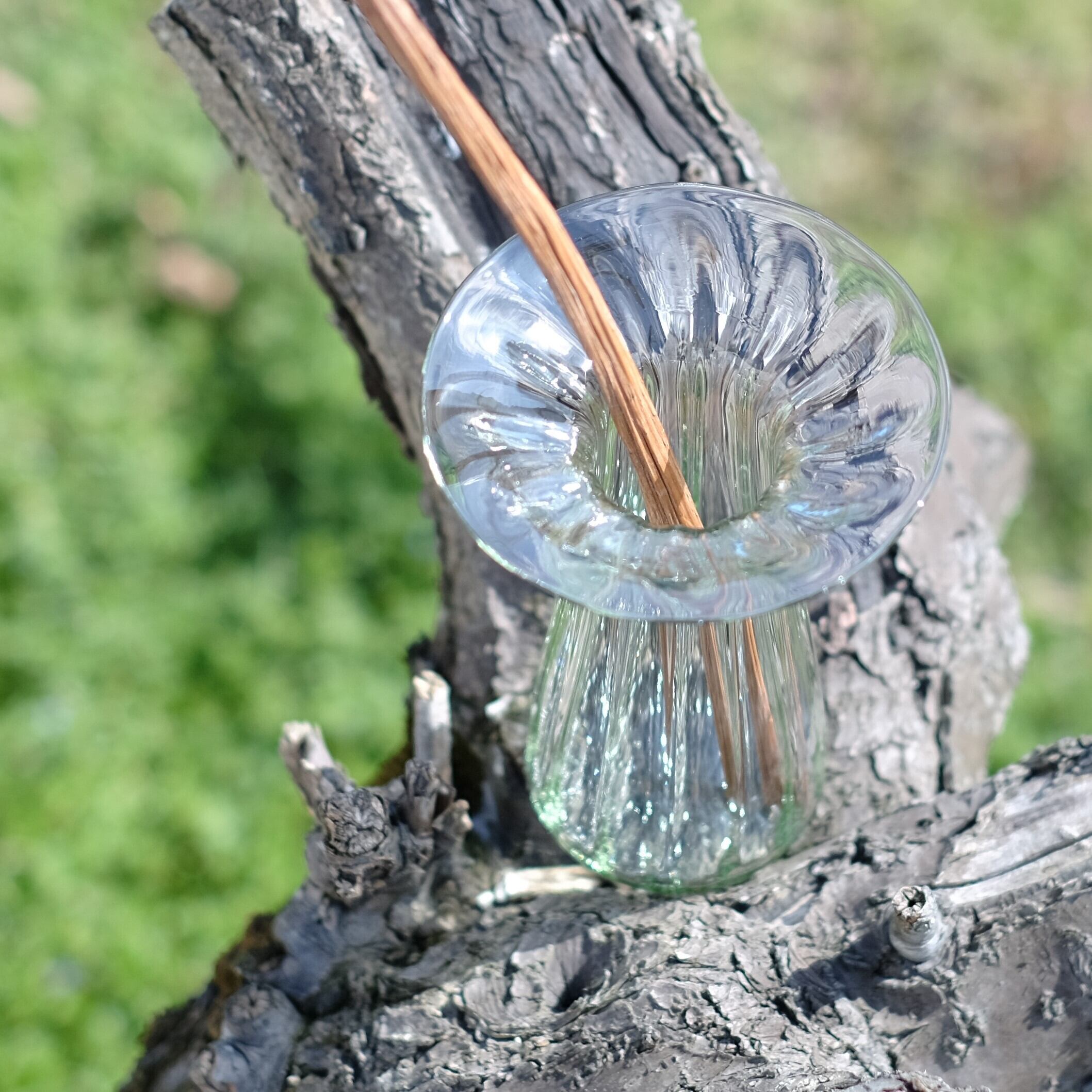 地元岩国の特産品『岩国れんこん』を“灰”にして、ガラスの原材料と混ぜ、高温の溶解炉で溶かしあわせます。すると、“灰”の成分により、ガラスが優しい若緑色に発色します。