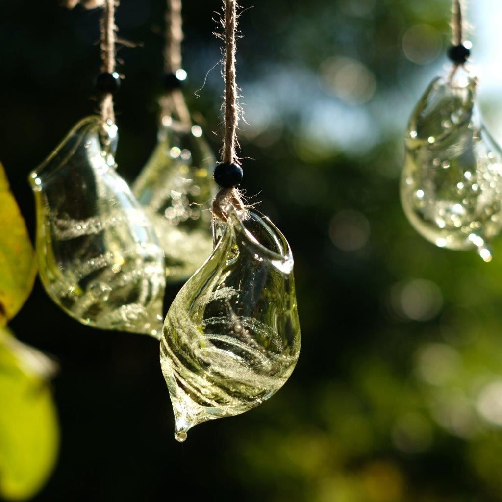 ガラス工房マルの地元山口県岩国の特産品『岩国れんこん』を“灰”にして、ガラスの原材料と混ぜ、高温(約1300℃)の溶解炉で溶かしあわせます。すると、“灰”の成分により、ガラスが優しい若緑色に発色します。